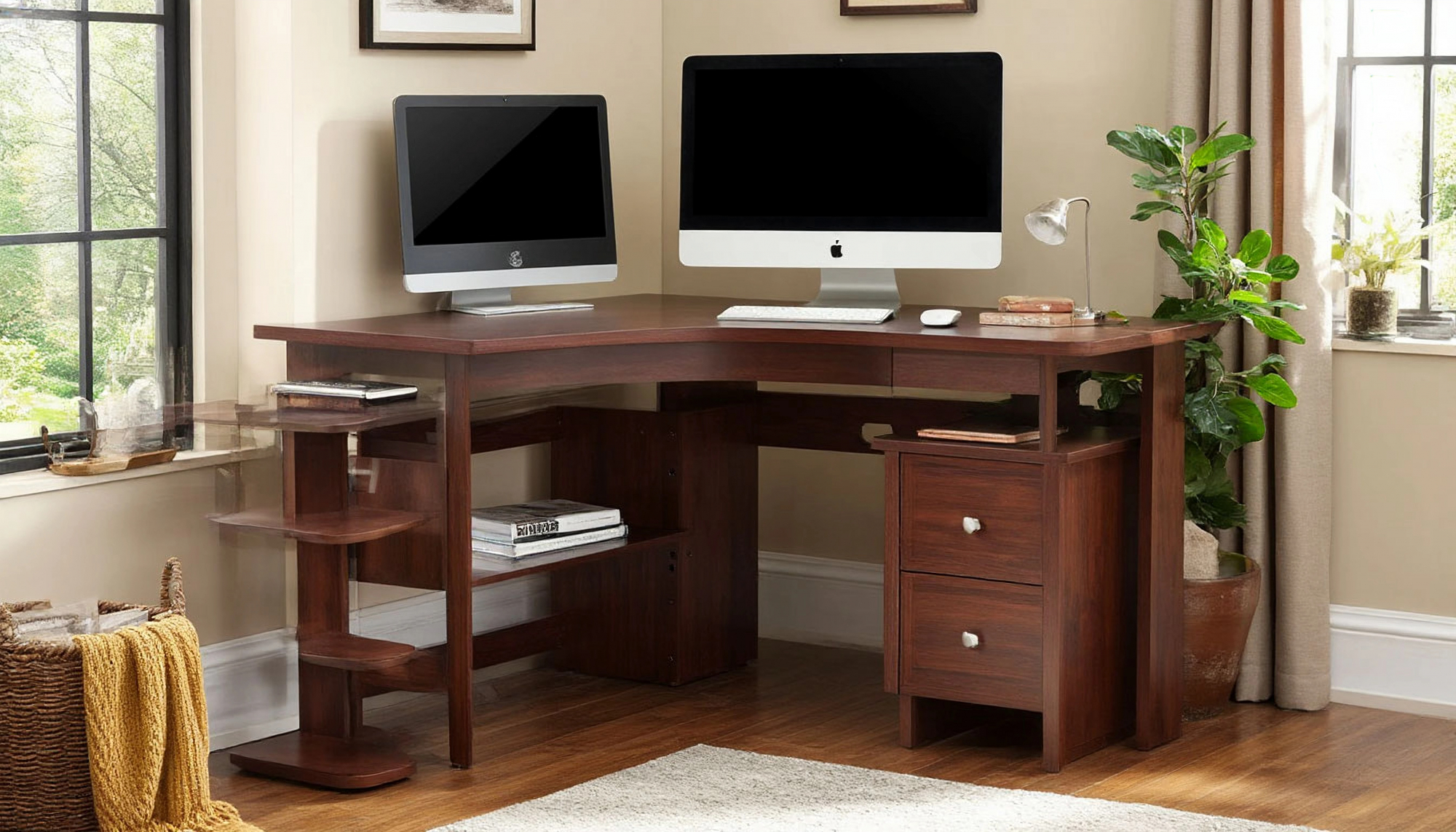 Одной из главных особенностей углового стола является его продуманная конструкция. Столешница имеет достаточную площадь, что позволяет разместить на ней не только компьютер и монитор, но и дополнительные аксессуары — такие как принтер, настольная лампа или органайзер для канцелярии. Благодаря угловому дизайну, вы сможете эффективно использовать каждый сантиметр пространства в комнате, что особенно актуально для небольших помещений. Угловая форма стола позволяет создать уютный рабочий уголок, который не будет загромождать пространство и оставит место для свободного передвижения. Это особенно важно для тех, кто работает из дома или учится онлайн, поскольку комфортная обстановка способствует повышению продуктивности.