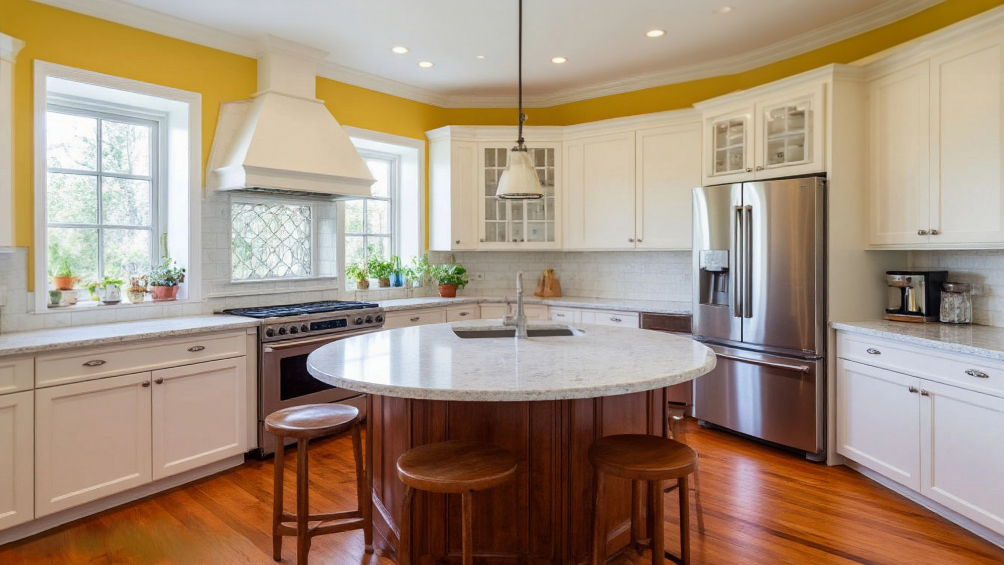 Столешница кухни сочетает в себе практичность и эстетическую привлекательность. Светлый искусственный камень или дерево устойчивы к механическим повреждениям, легко очищаются и обеспечивают удобство при приготовлении пищи. Рабочая зона организована таким образом, чтобы повар имел все необходимое под рукой, а пространство оставалось удобным и свободным.