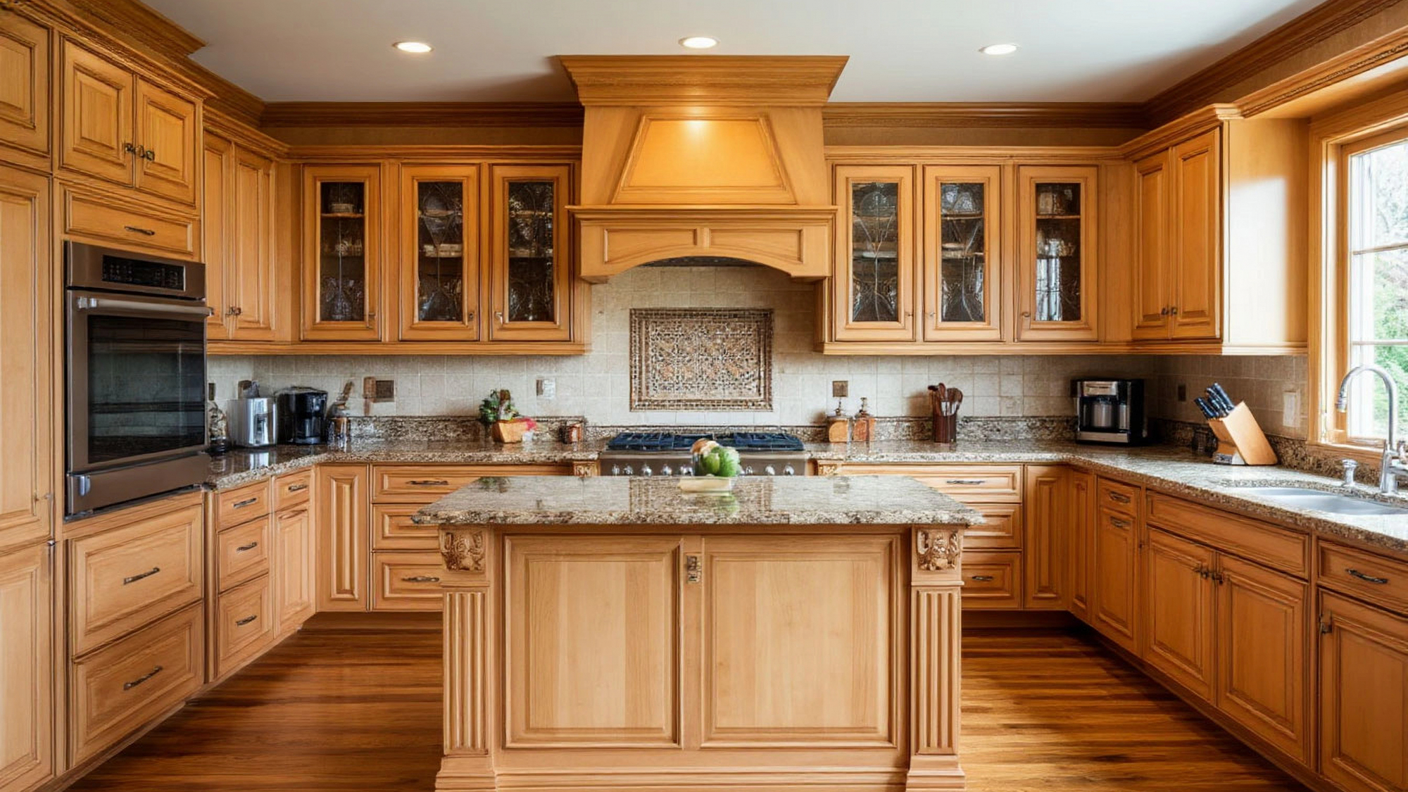 Фасады под дерево в цвете карамели придают кухне удивительное ощущение глубины. При дневном освещении они сияют мягким золотистым светом, а вечером, при тёплой лампе или свечах, становятся ещё уютнее, словно согревают взгляд. Этот эффект нельзя передать словами — его нужно почувствовать. Кухня словно оживает при свете, отражая его мягкими бликами, будто вдыхает тепло и делится им со всеми, кто входит в комнату.