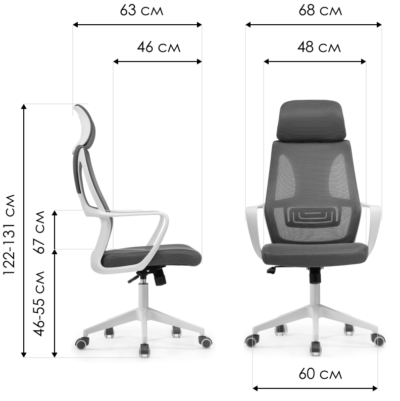 Высота подлокотников: 67 см. Высота спинки: 74 см. Диаметр крестовины: 60 см.